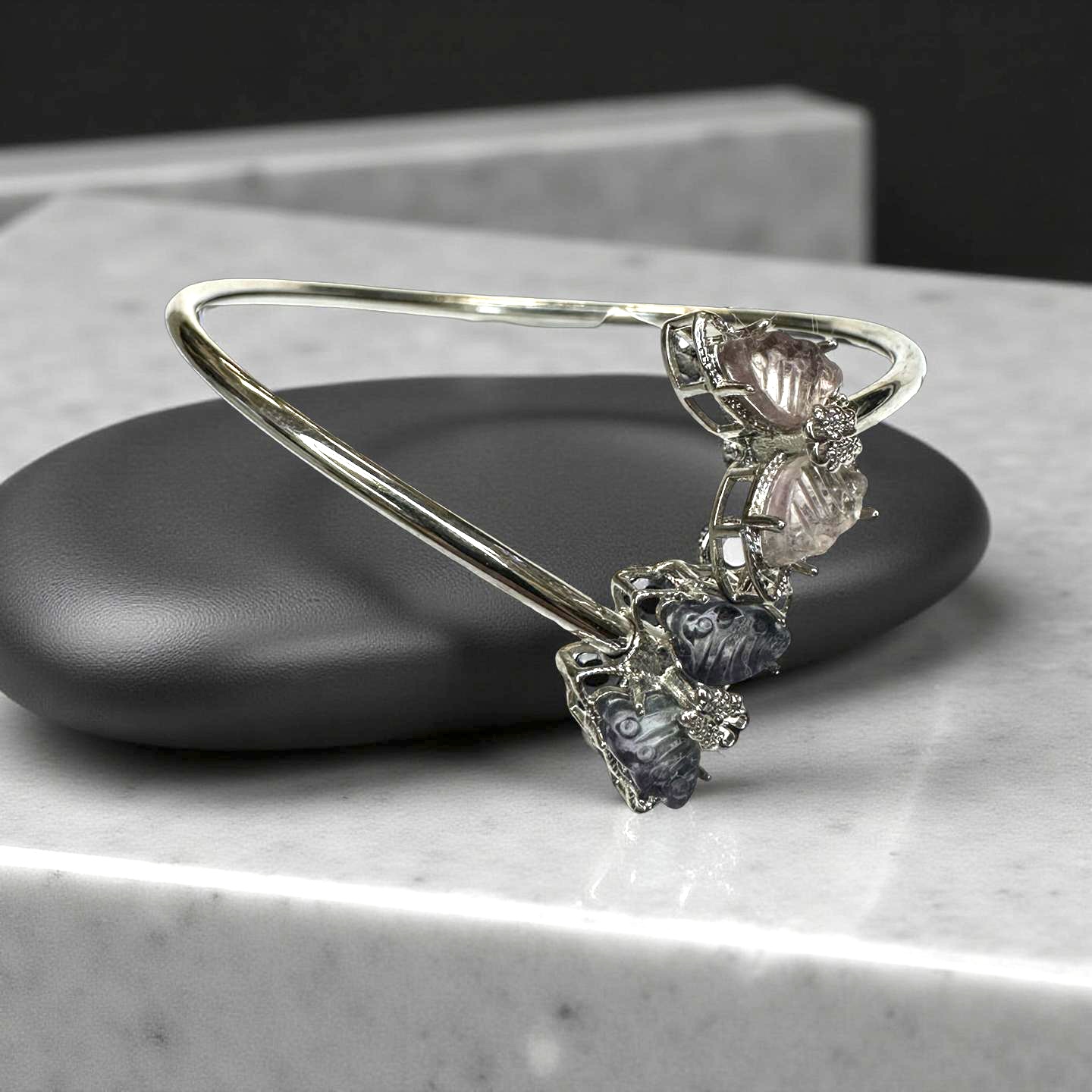 Vackert ställbart, ledat armband i stål och silverpläterat. Fjärilarna är i fluorit och kan skilja sig åt i färg.