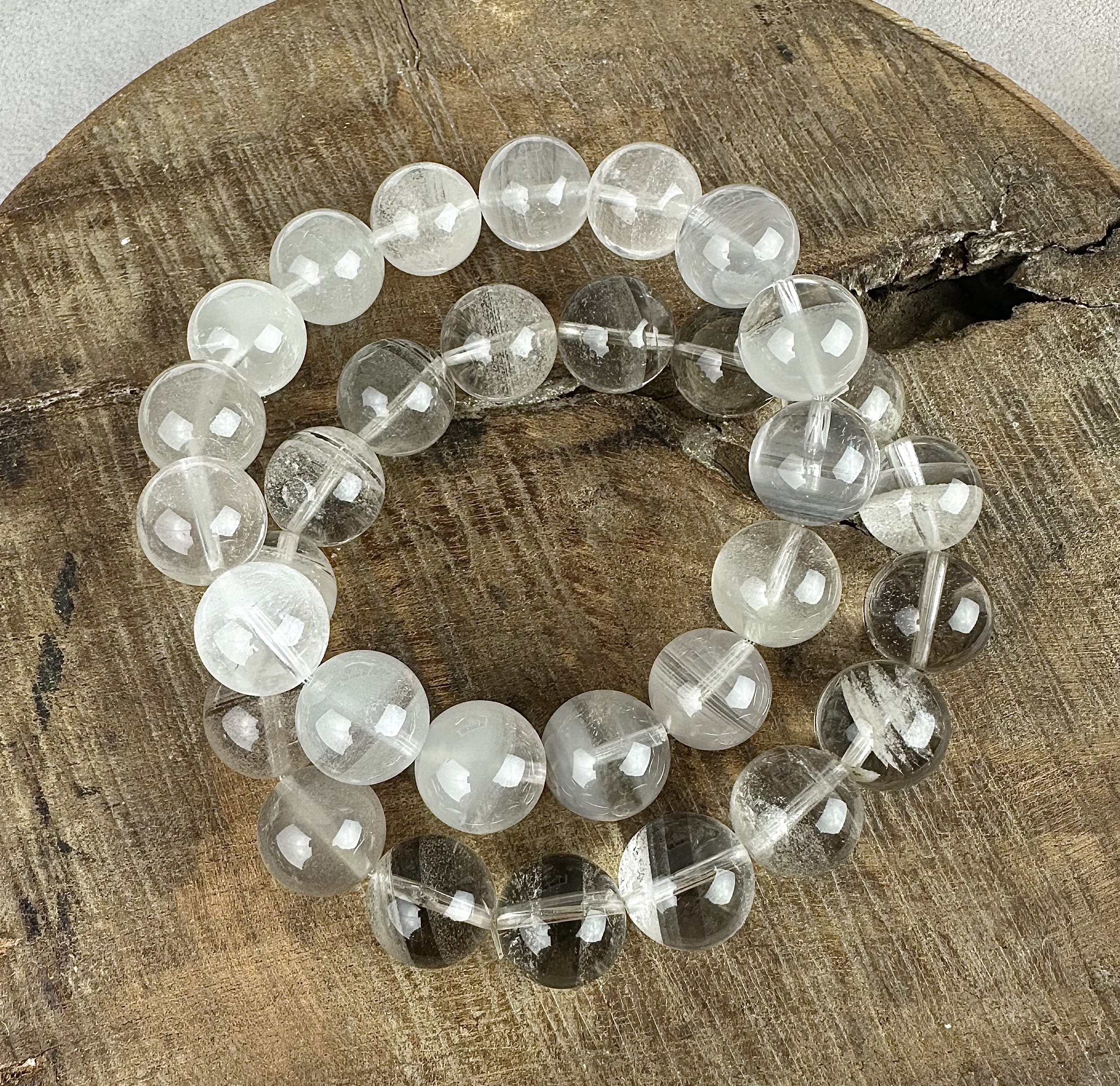Vackert, elastiskt armband av bergkristall med inklusioner och fantomer.