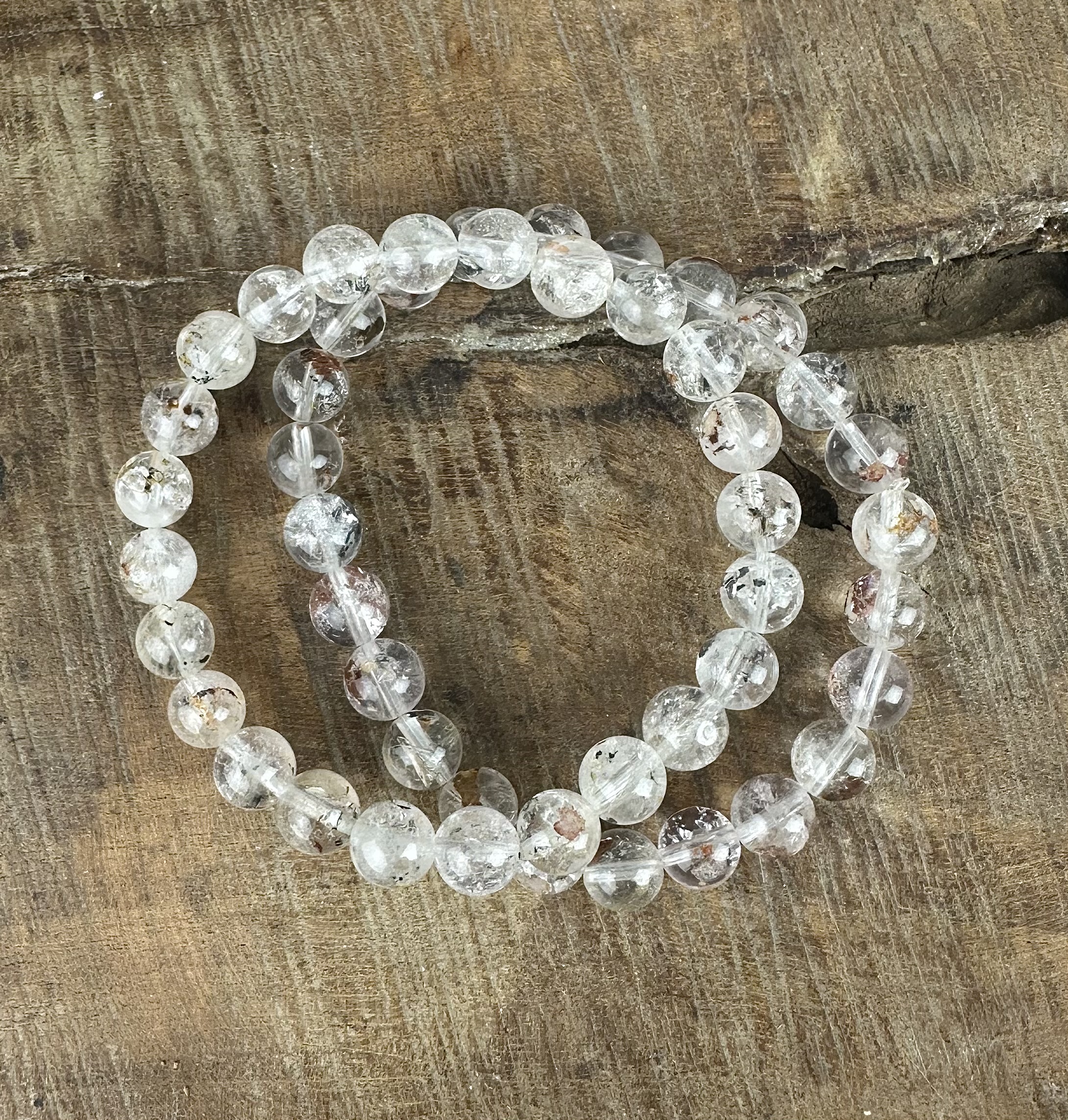 Vackert, elastiskt armband av bergkristall med inklusioner av hematit och järn.
