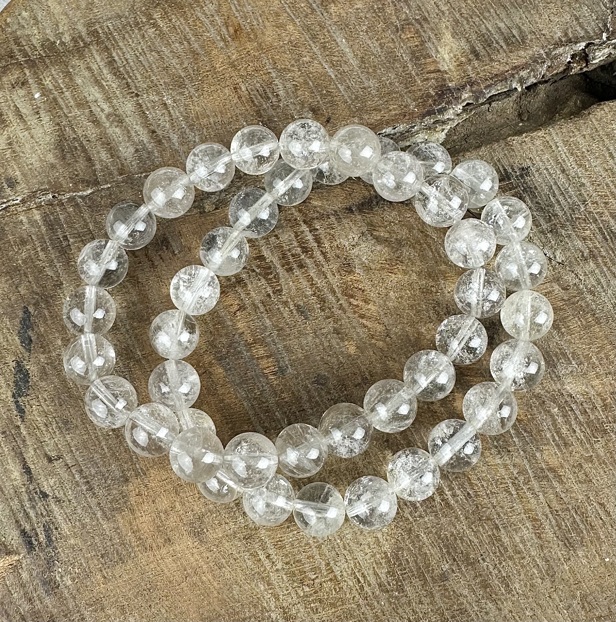 Vackert, elastiskt armband av bergkristall som slår åt det grå/bruna hållet.