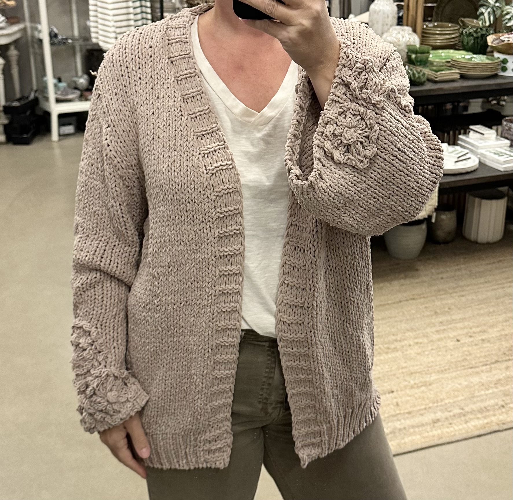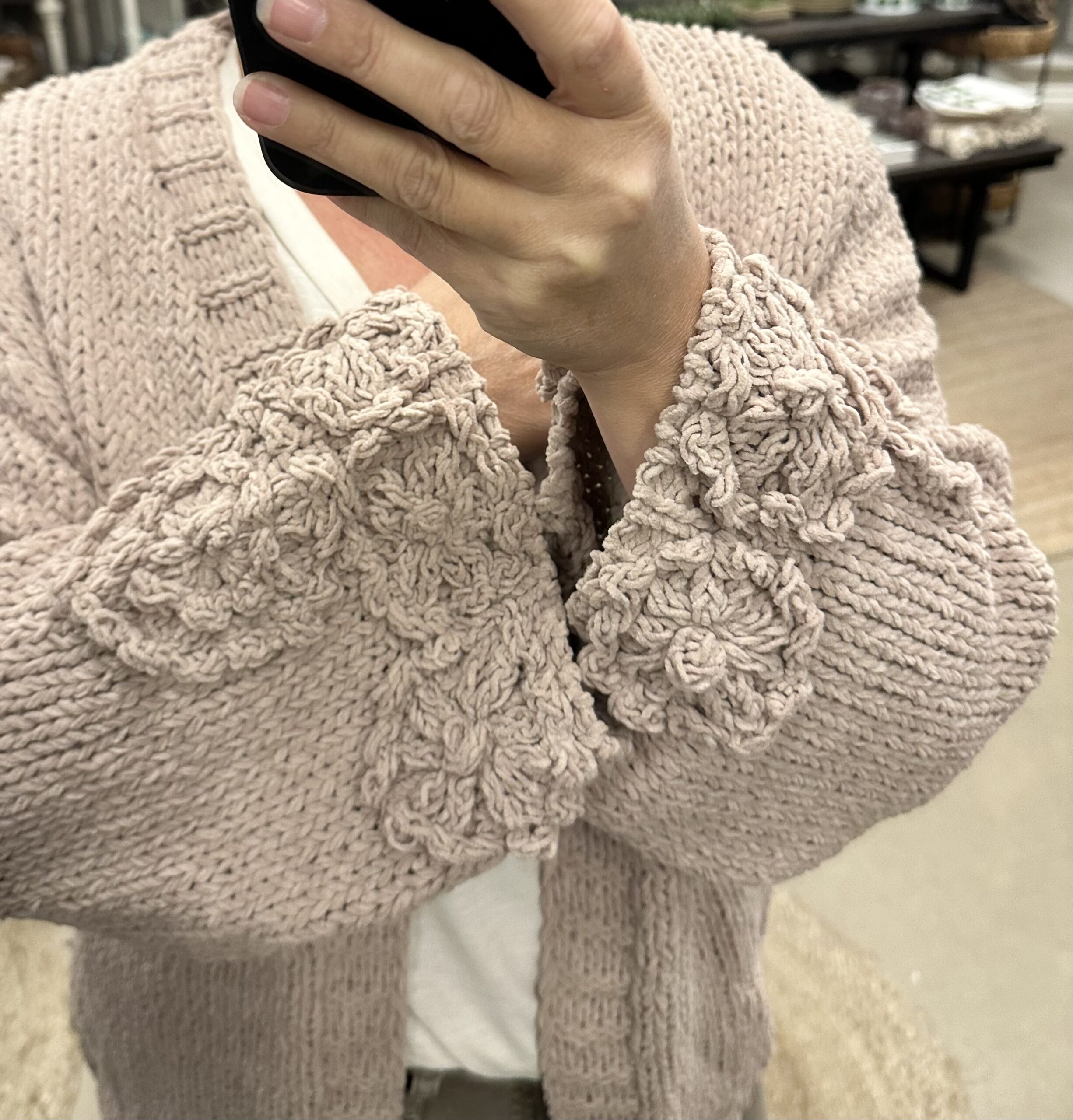 MODELL: Ljuvlig kofta i öppen modell med blomdekor i ärmsluten. Något utställd ärm. Skön chenille.