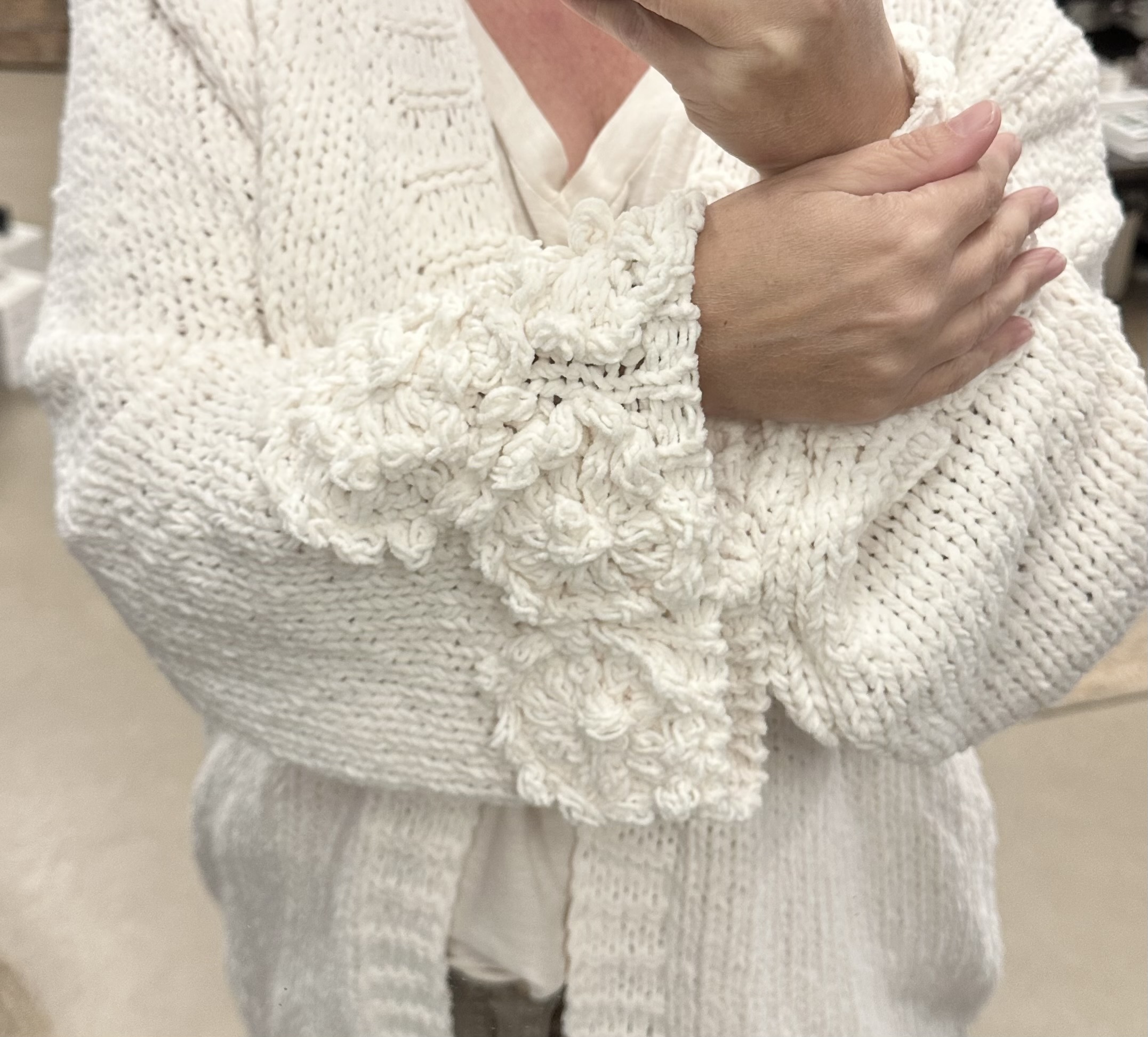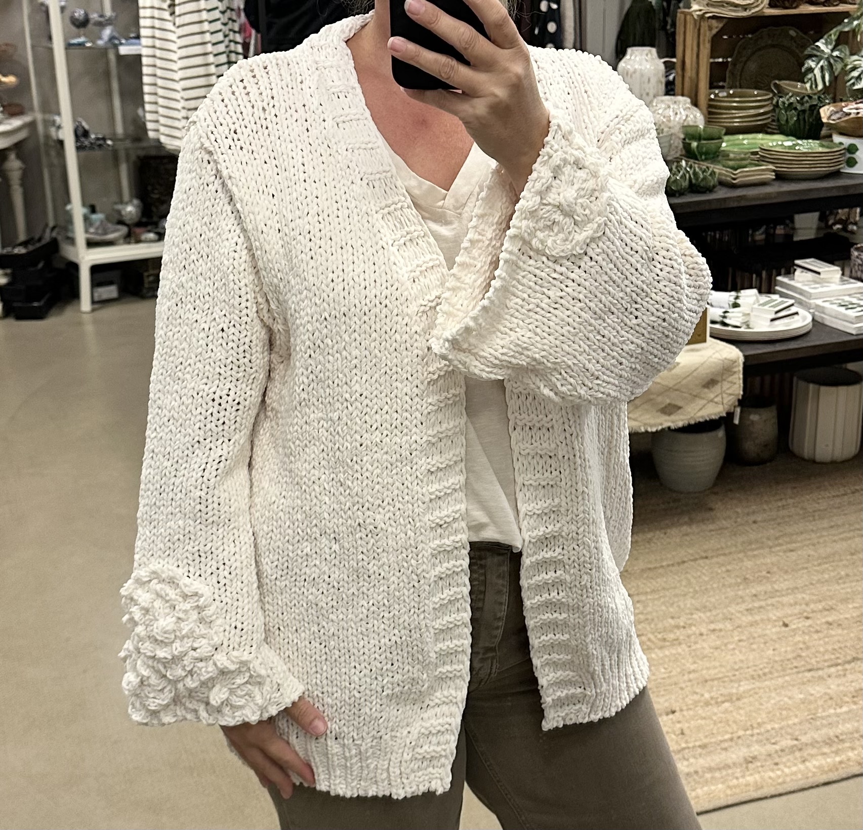 MODELL: Ljuvlig kofta i öppen modell med blomdekor i ärmsluten. Något utställd ärm. Skön chenille.