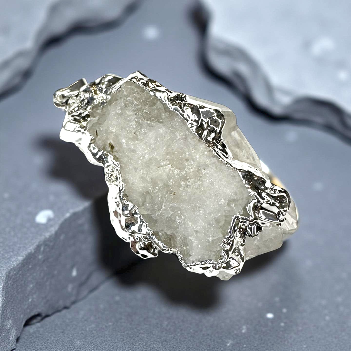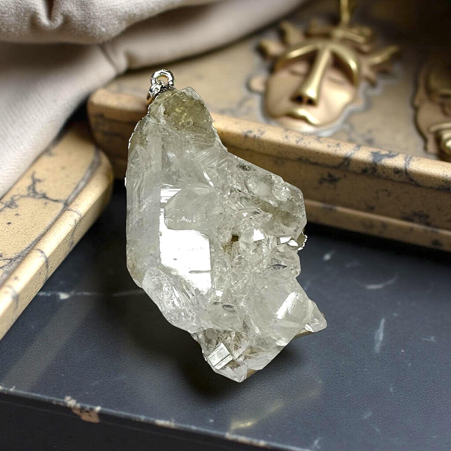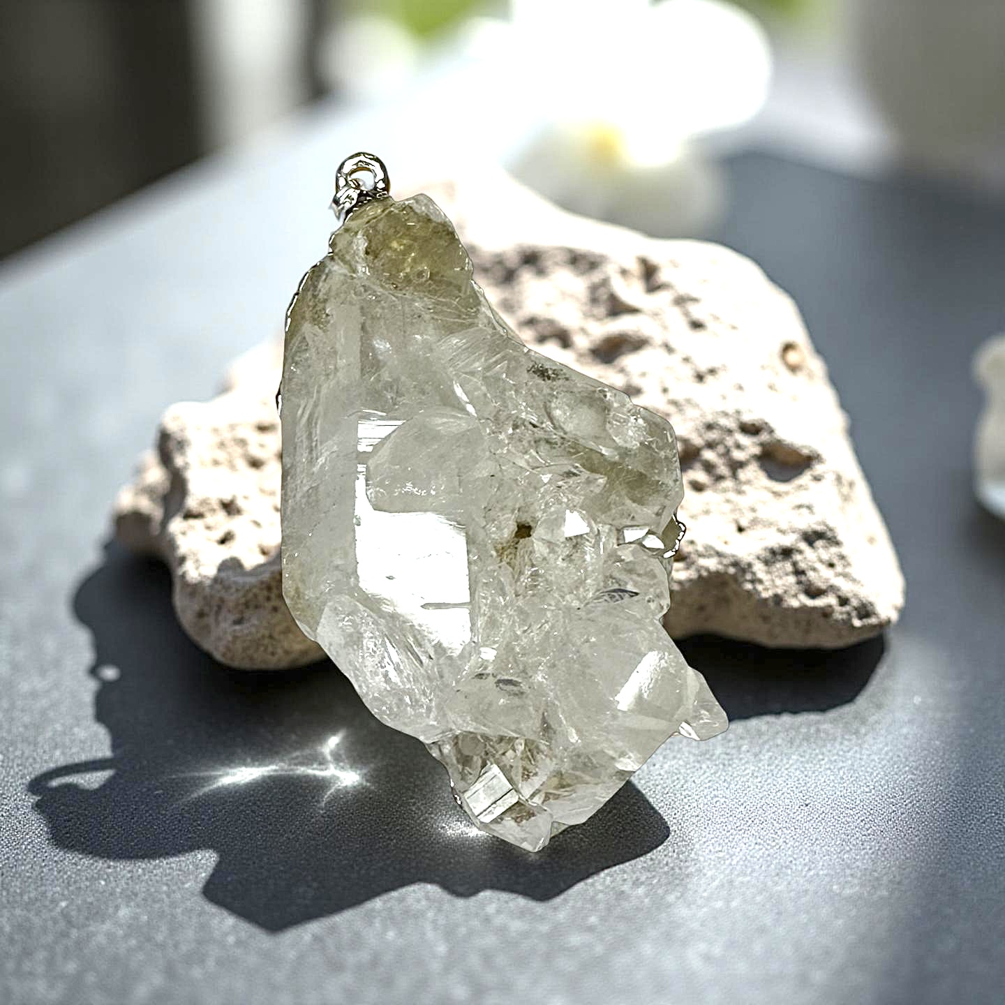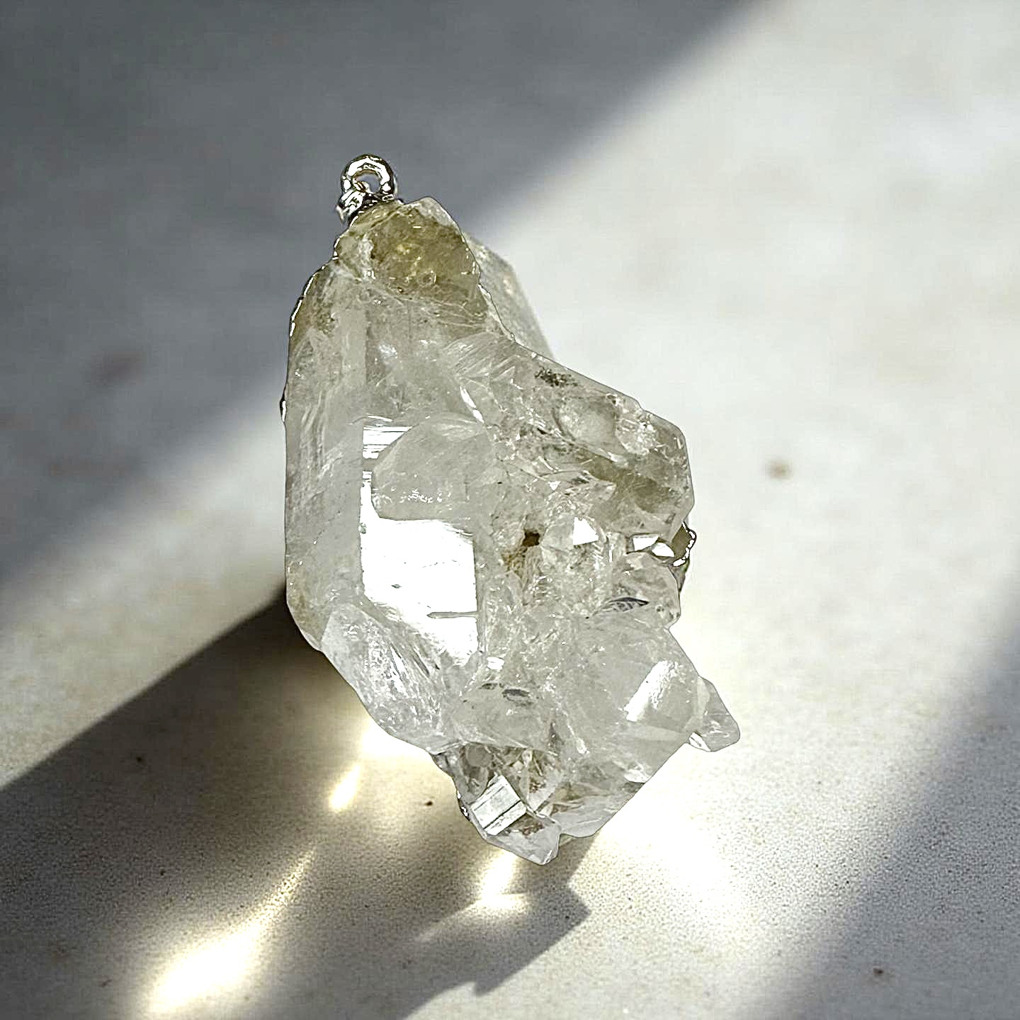 Vackert hänge i rå bergkristall och elektroplätering.