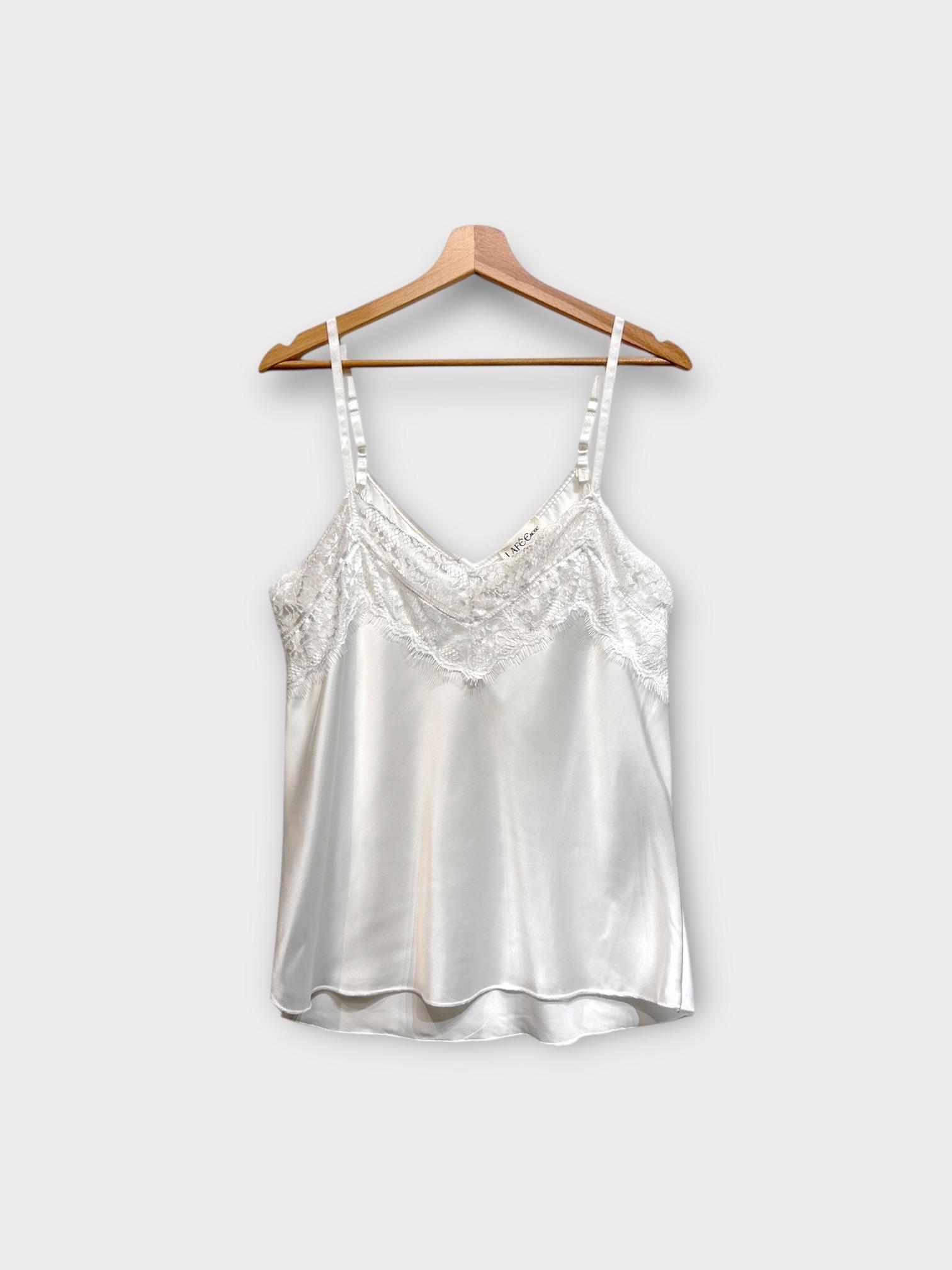 MODELL: Snyggt linne i sidenkänsla med vackra spetsdetaljer. Ställbara axelband.