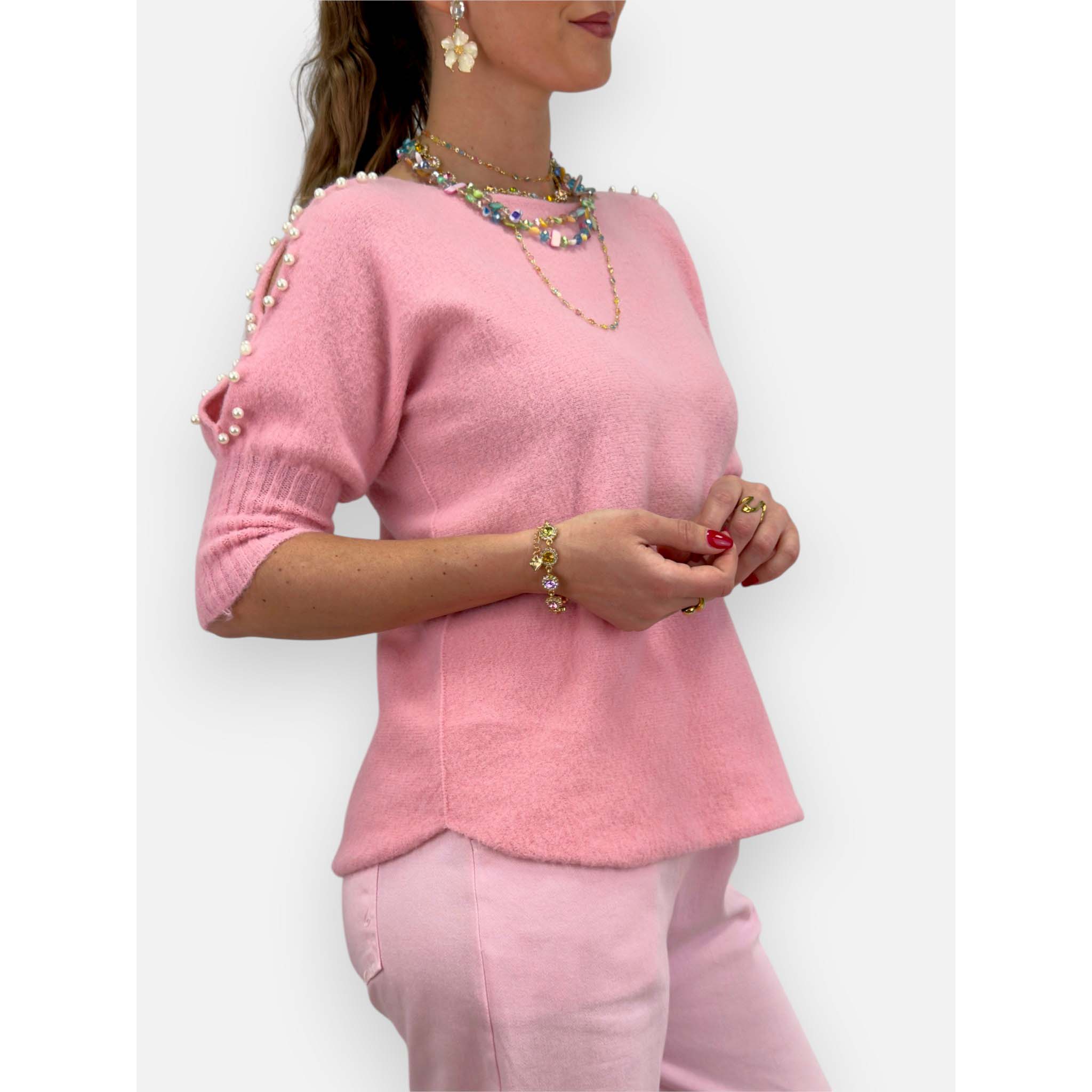 MODELL: Söt, kortärmad top i stickat med pärldekoration i ärmen.