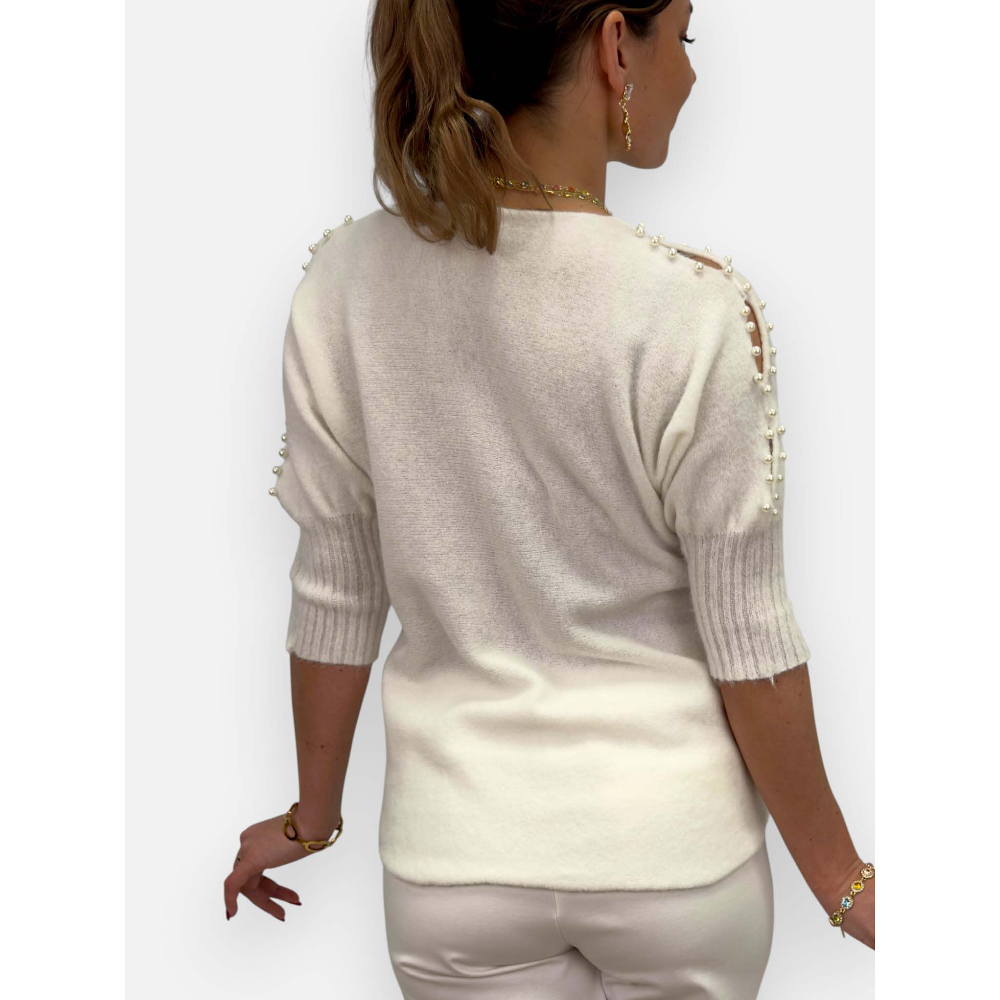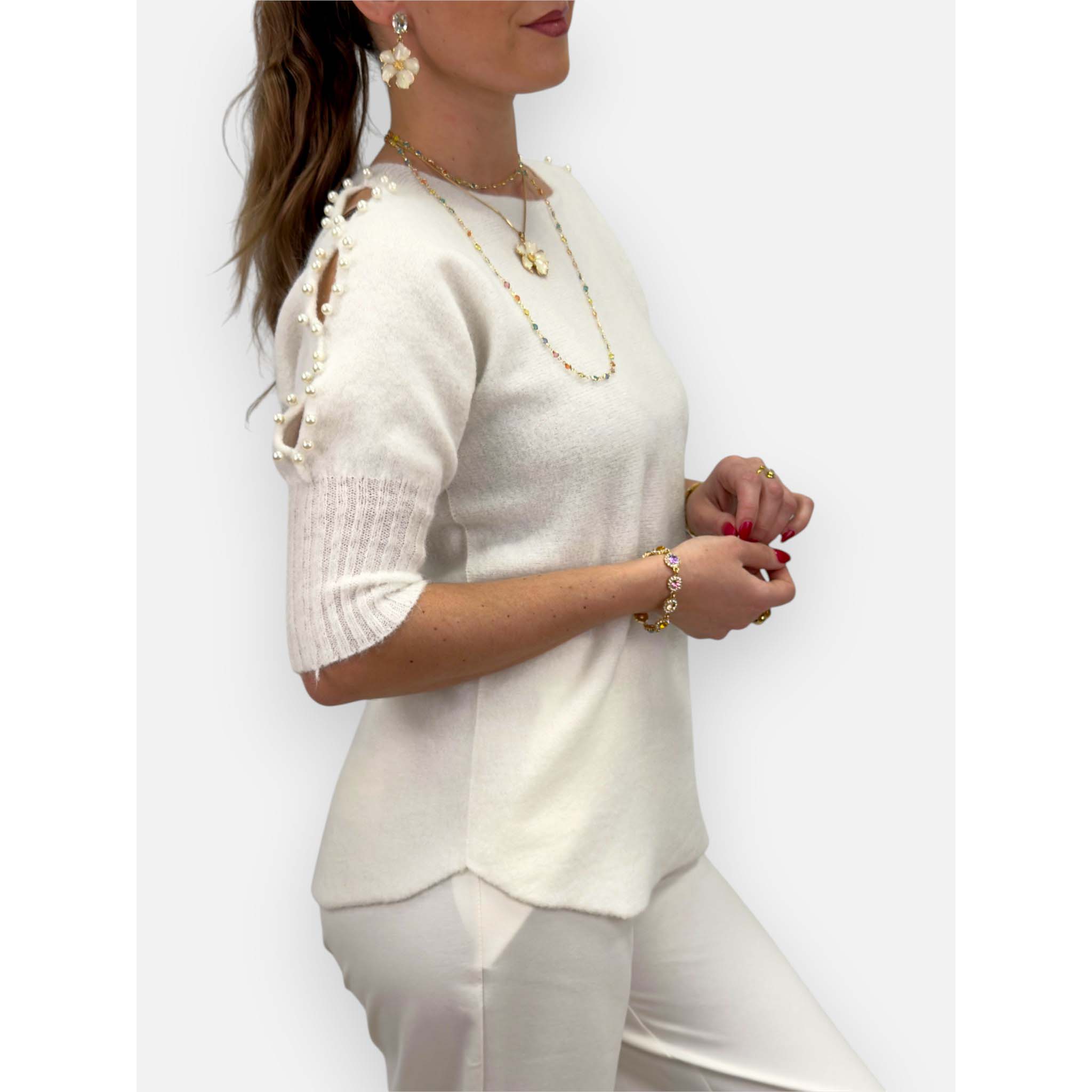 MODELL: Söt, kortärmad top i stickat med pärldekoration i ärmen.